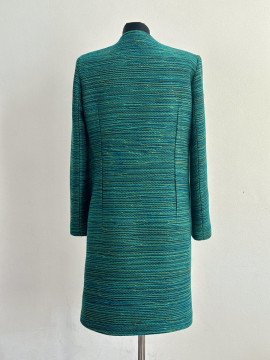The coat has a straight, slightly fitted cut, fastening with 5 snap buttons, decorative gold buttons, and practical front pockets. The minimalist design without collar highlights the color and weaving of the fabric, which ranges in shades of turquoise-green.